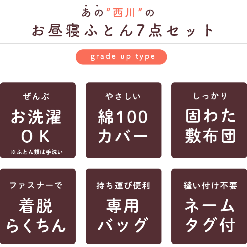 バリエーション一覧 ベーシックタイプ グレードアップタイプ 洗い替えに カバー2点セット keyword | お昼寝布団 西川 東京西川 西川産業 お昼寝ふとん お昼寝布団 おひるね お昼寝 お昼寝布団セット お昼寝ふとんセット 幼稚園 保育所 こども園 ベビー キッズ 子ども 綿100% コットン 男の子 女の子 キャラクター ハローキティ キティ キティちゃん サンリオ キキララ マイマロ シナモロール それいけ!アンパンマン ばいきんまん ドキンちゃん ピンク イエロー お出かけ 入園 バッグ 手提げバッグ 名札 ネームタグ 洗える 全部洗える ウォッシャブル 固綿 固わた 敷布団>> ヒモタイプのお昼寝ふとんはこちら << >> お昼寝ふとん用防水バッグはこちら << ※写真はイメージです。